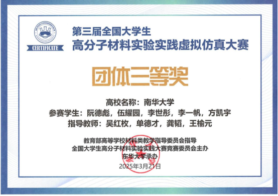3月21日晚第三届全国大学生高分子材料实验实践仿真大赛决赛在全国各高校同步举行,来自四川大学、天津大学、北京化工大学、华南理工大学等高校在内的79所高校、全国高分子材料专业超过千余名学生参赛。我校bv伟德国际1946高分子材料工程系20名学生在吴红枚、单德才、龚韬、王榆元四位指导老师带领下参加本年度双实仿真大赛的角逐。比赛结果已于近日公布,我校学子成绩优异,我校参赛队伍首次收获团体三等奖奖项,阮德彪、伍耀园获得个人一等奖,李世彤等8名同学获得个人二等奖。