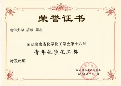 2022年10月26日,湖南省化学化工学会公布8位“湖南省第十八届青年化学化工奖”得主,我院青年高层次人才胡蓉博士获此殊荣。