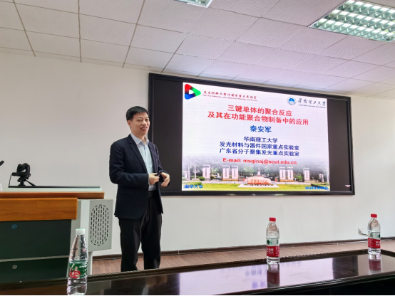 报告中,秦安军教授系统性介绍了五种类型的基于炔类单体的点击聚合方法:硫醇-炔点击聚合、氨基-炔点击聚合、羟基-炔点击聚合、内部炔基聚合以及腈-叠氮点击聚合,这类点击聚合方法具有反应高效、结构选择、条件温和和原子经济等特点,因此在功能聚合物的设计和合成中具有广泛的应用前景。此外,秦安军教授对基于该系列高效聚合物反应的应用进行了介绍,着重介绍了炔-胺点击反应在生物成像及诊疗领域的应用前景,引起了在场师生的浓厚兴趣和积极反响。